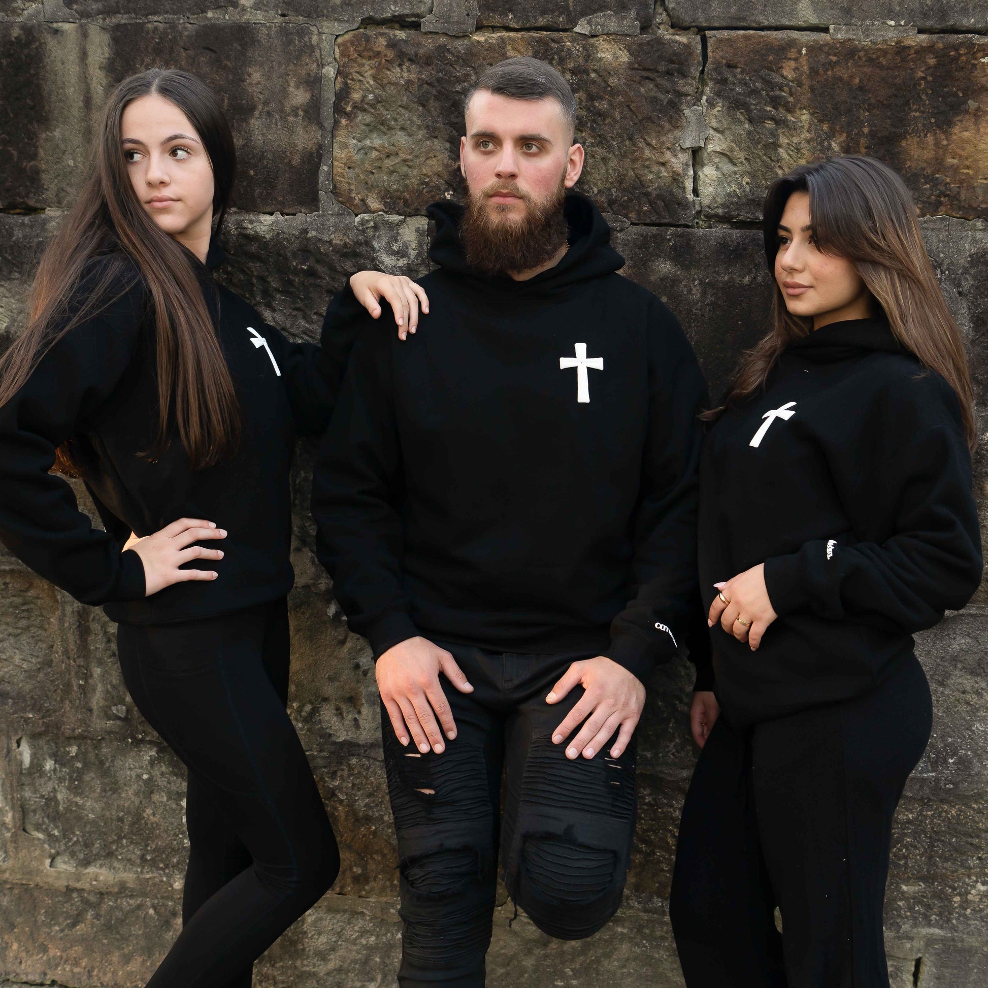 Models: Nick is wearing size L, Rochelle is wearing size S, Aleah is wearing size XS